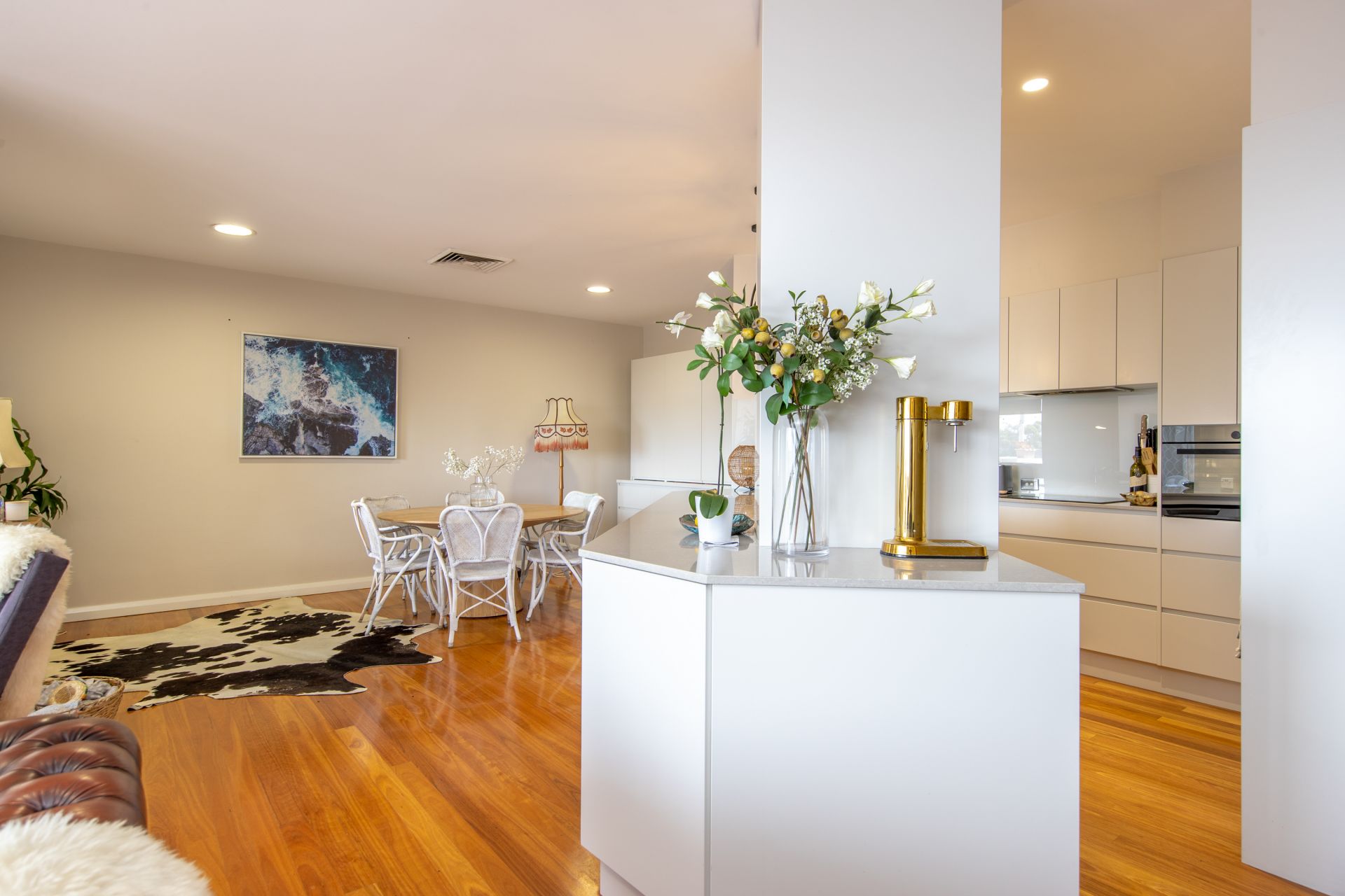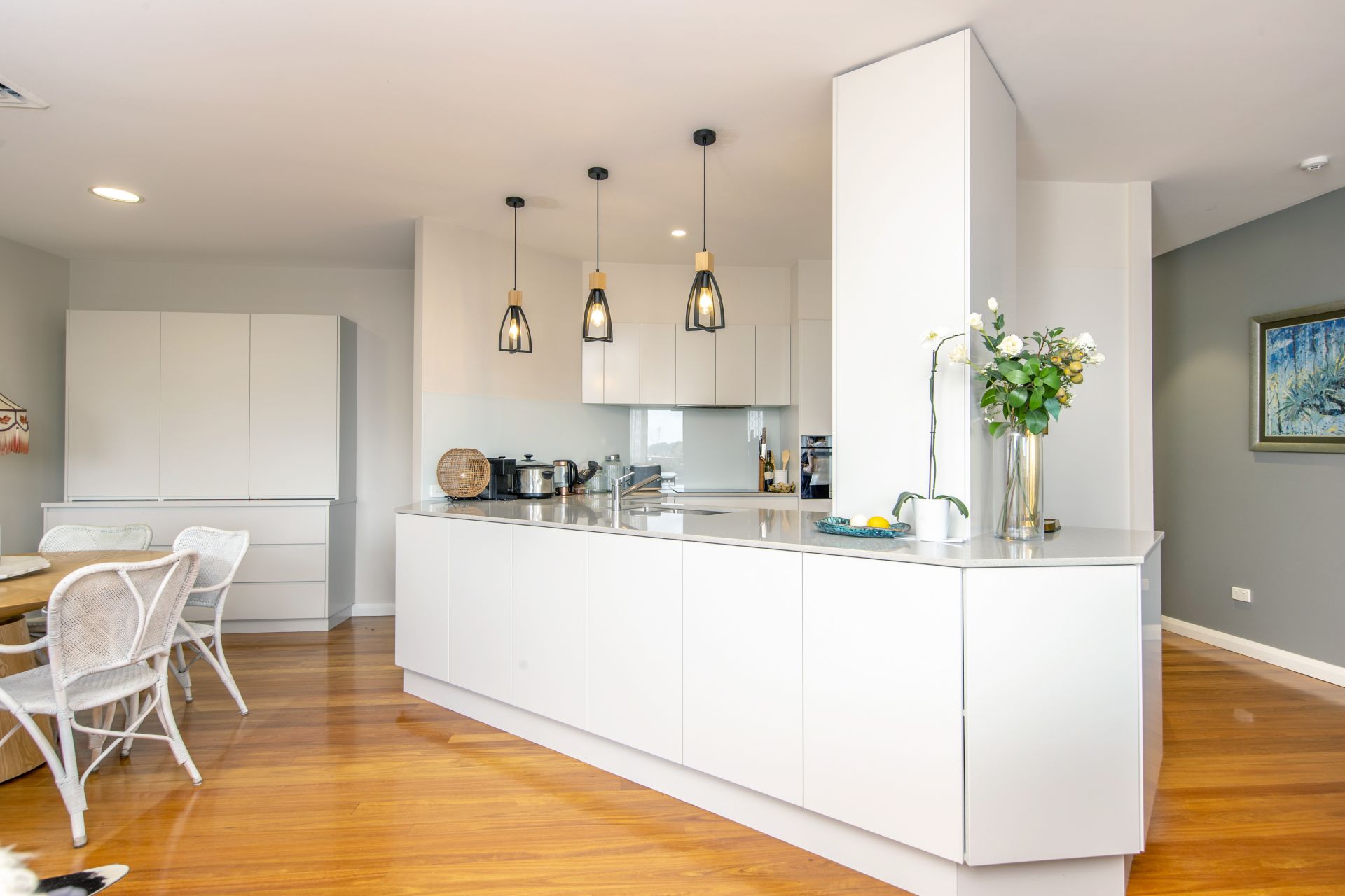 - Modern new kitchen with stone bench and custom joinery in living