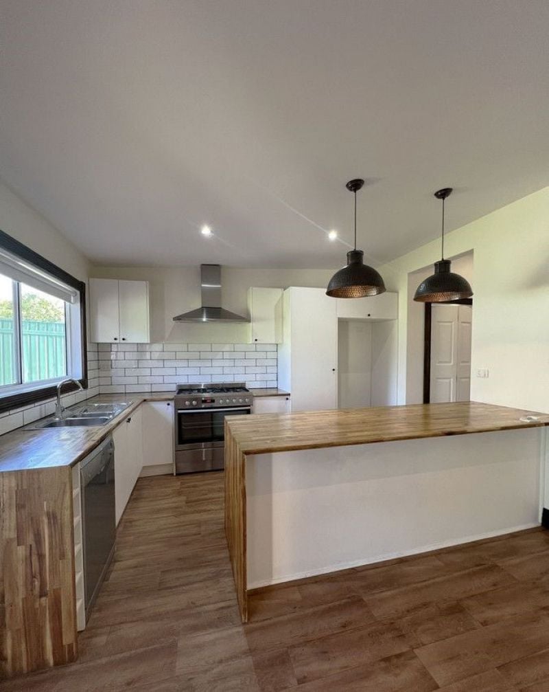 - Kitchen with 5 burner gas stove, dishwasher and large island bench