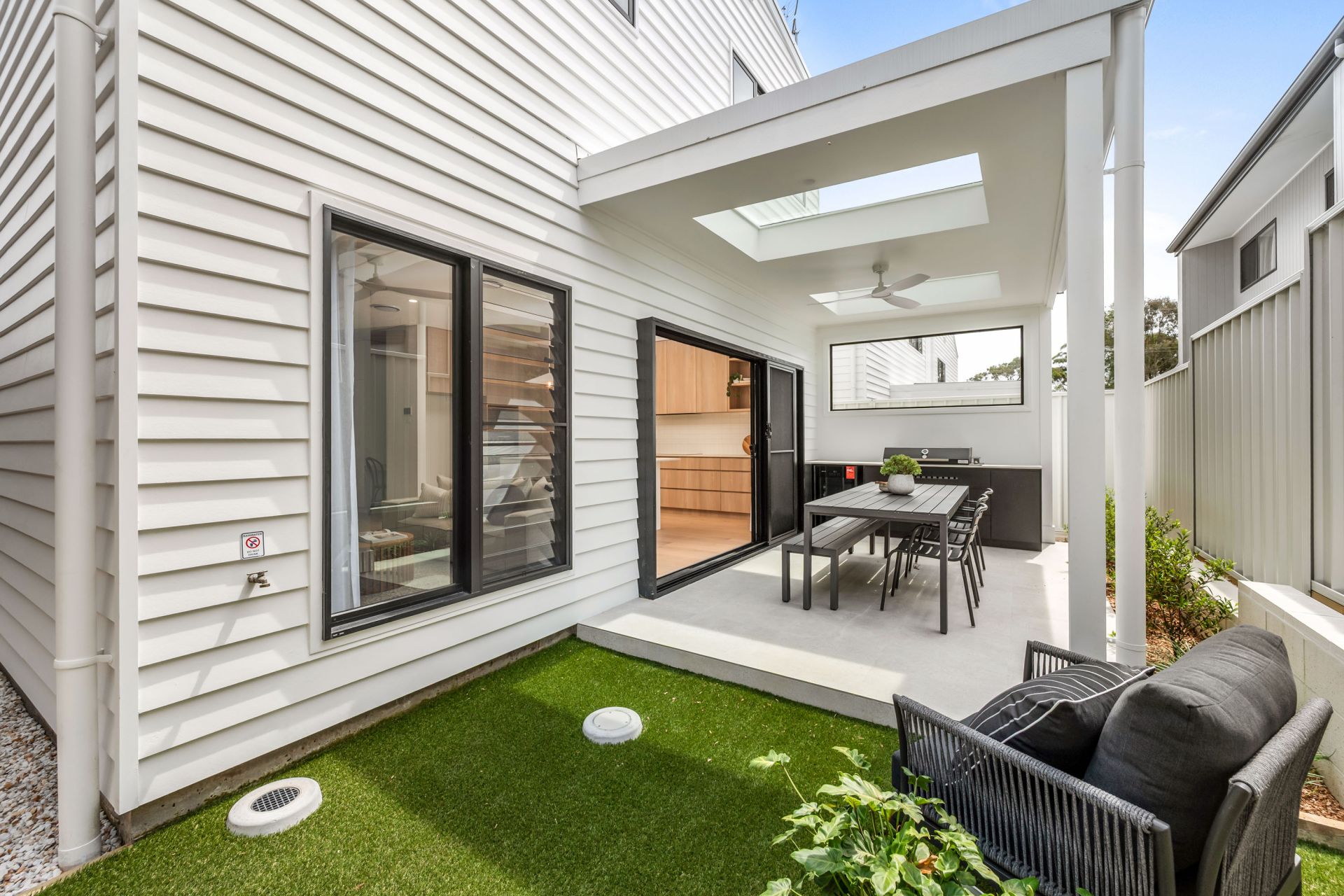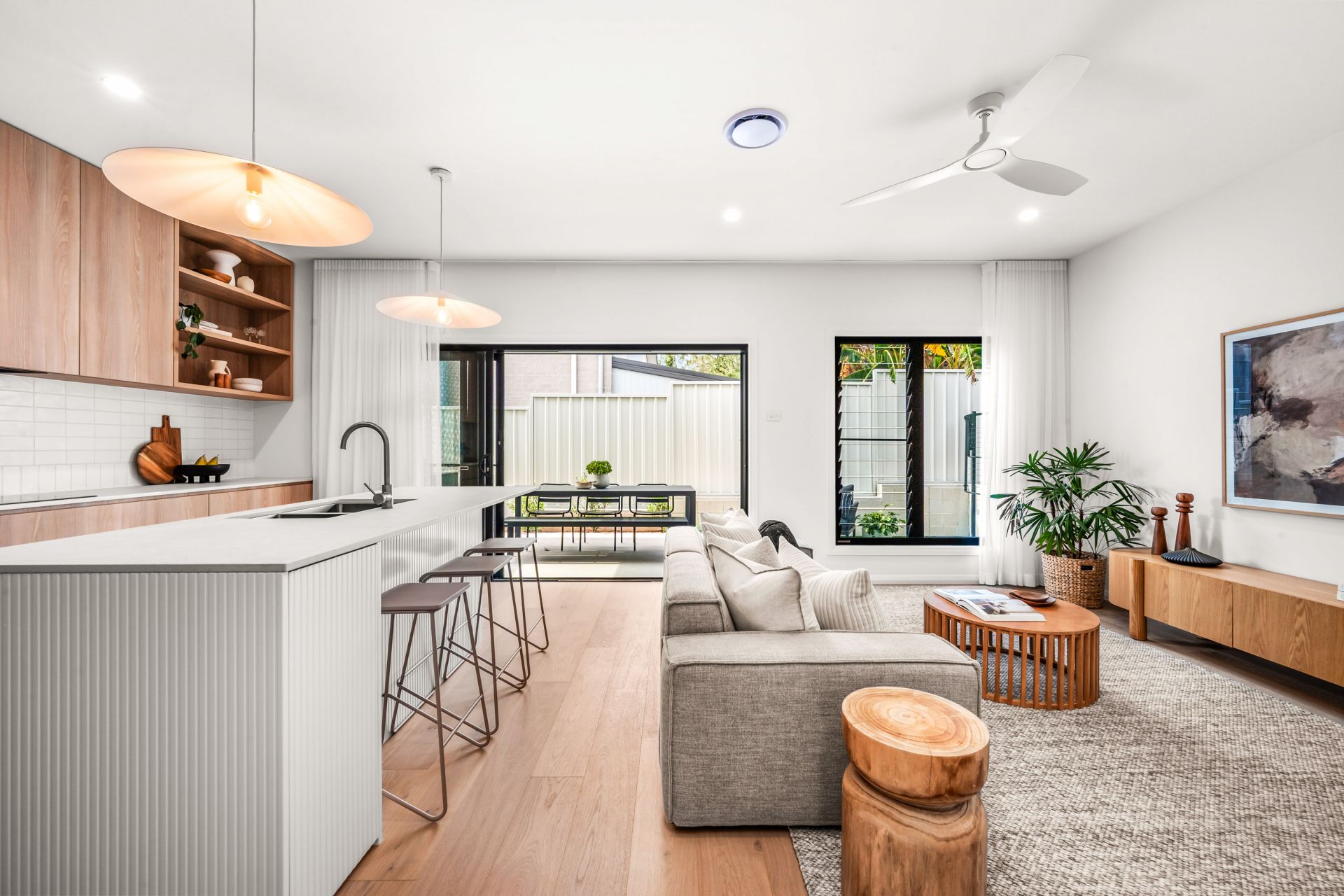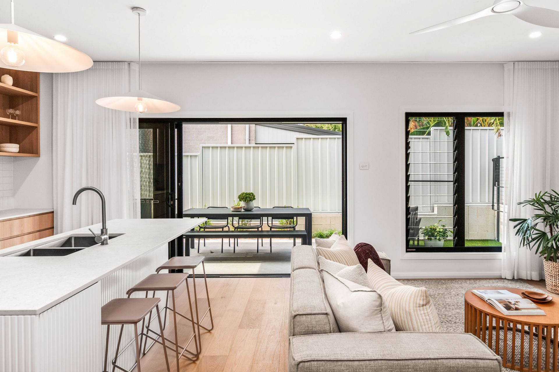 Step inside and you'll find a home that feels light, open, and generous. Downstairs, 2.7m ceilings frame the airy open-plan living space, anchored by a showpiece island kitchen. Upstairs, a second living area soars under 4.4m raked ceilings with clerestory windows streaming in natural light. There are three bedrooms, 2.5 high-end bathrooms, a home office nook, and a surprising amount of storage. Outdoors, each home enjoys a prized private north-east facing yard with a low-maintenance design, light-filled alfresco, and a fully equipped barbecue kitchen for relaxed entertaining.