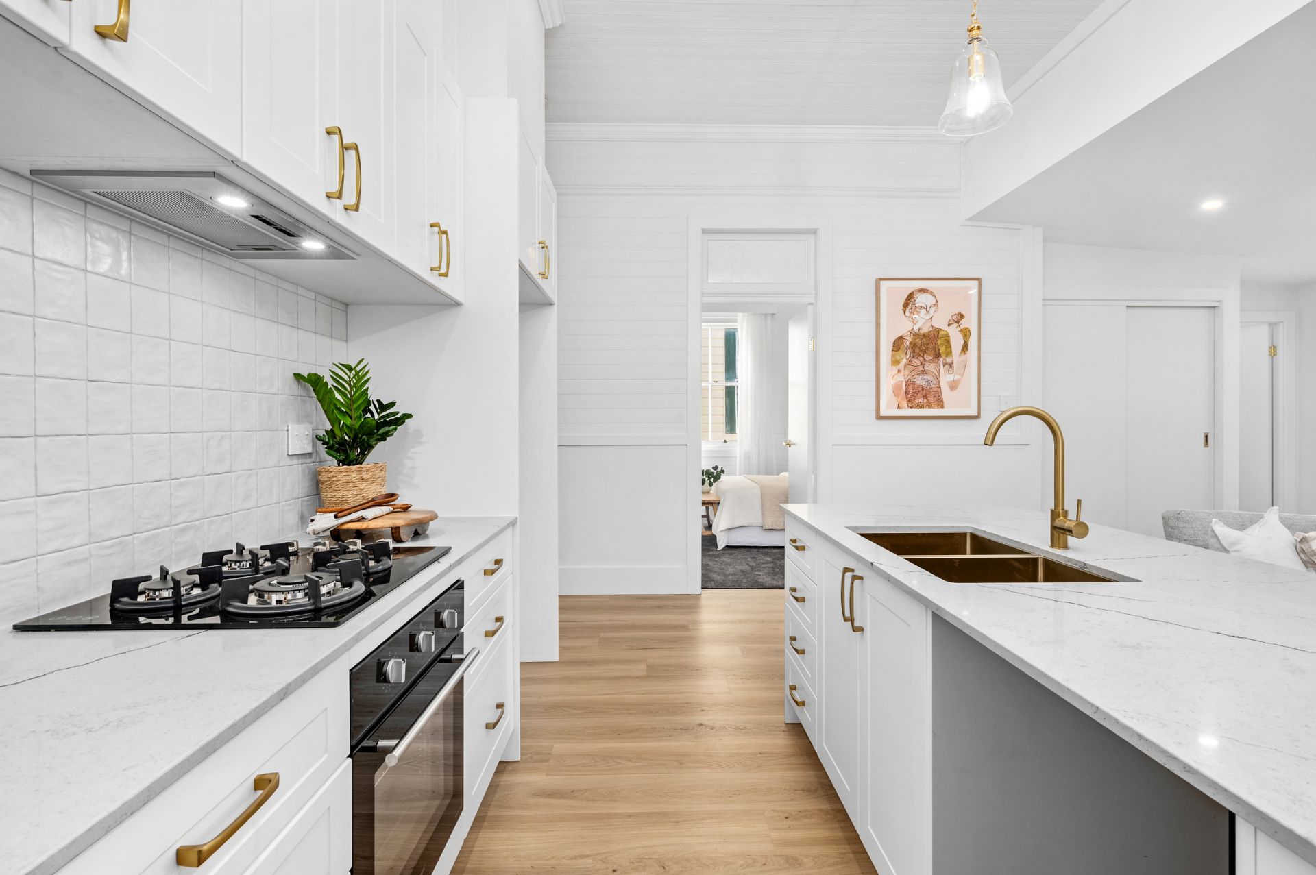 - Caesarstone kitchen with 4-burner gas cooktop, brushed brass double sink