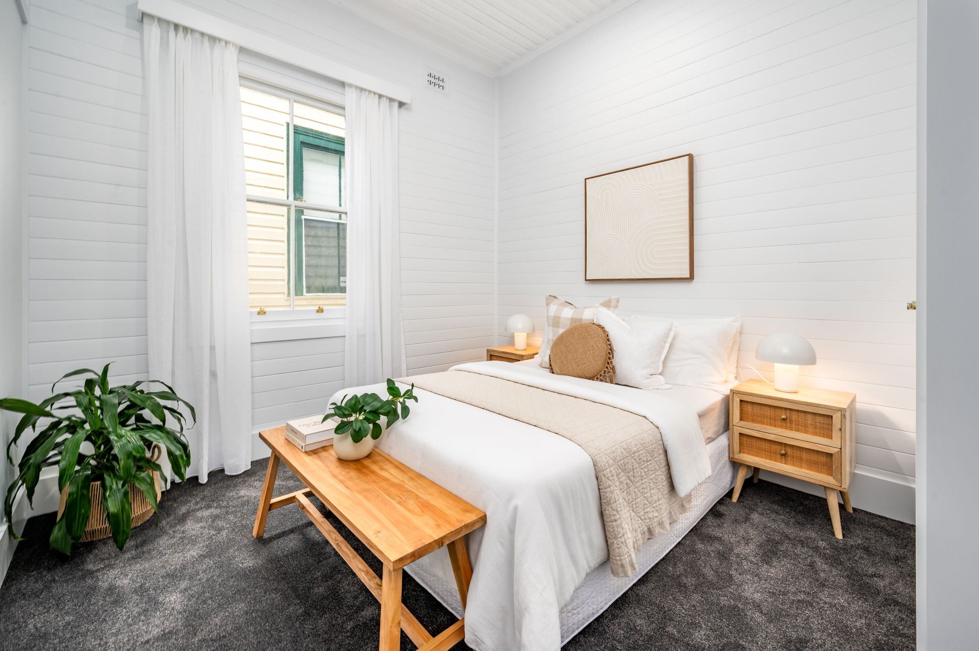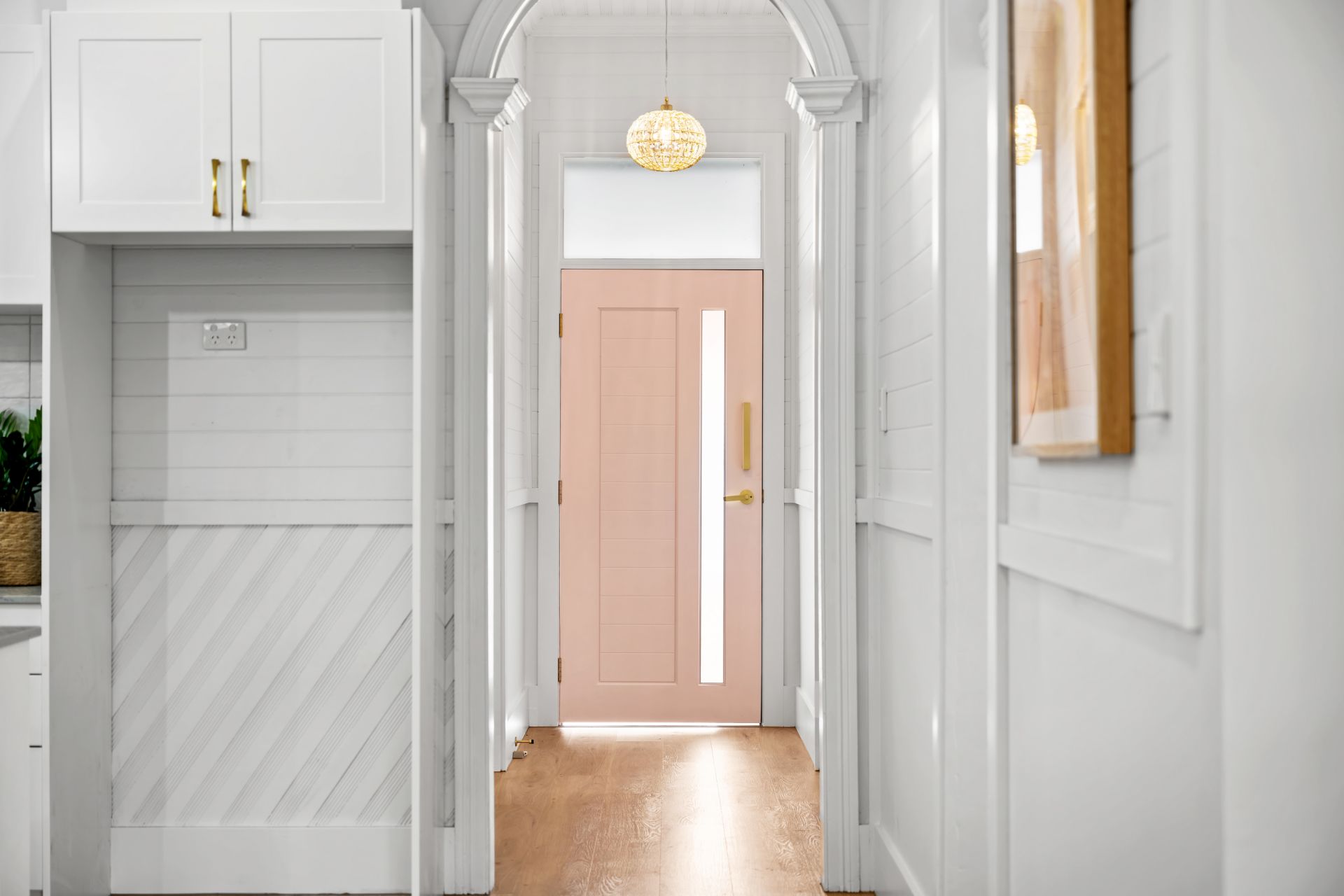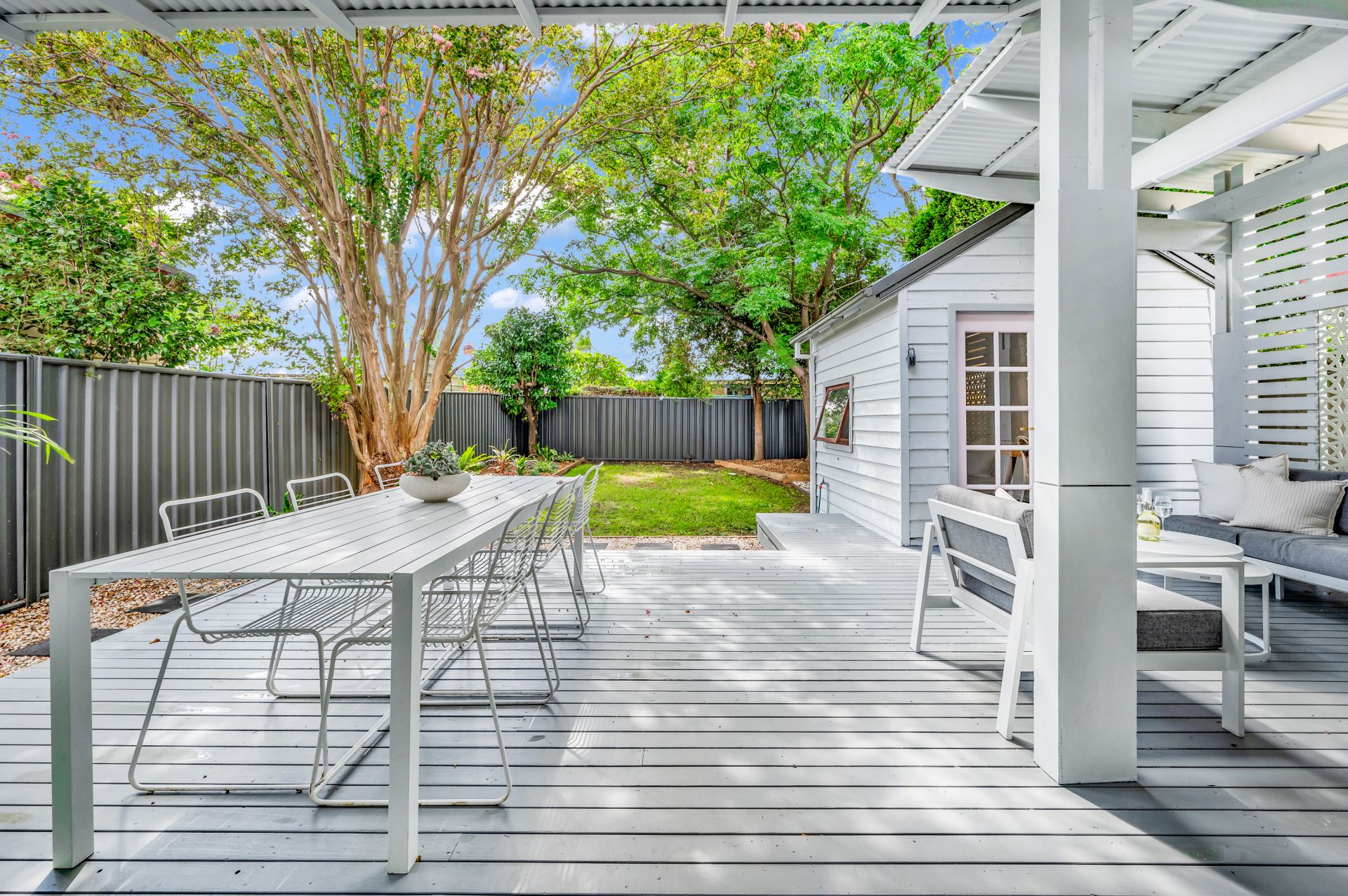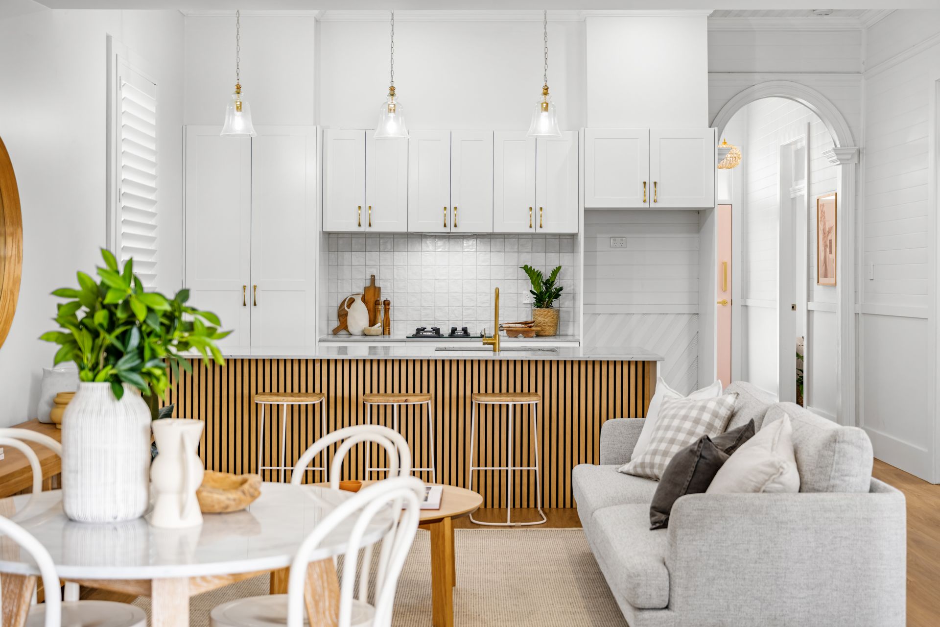 As you step onto the front verandah and through the charming pink front door, you're greeted by 10 ft ceilings stretching over new hybrid flooring in the hallway and living areas, complemented by plush new carpet in all three bedrooms. The brand new Caesarstone kitchen is sure to impress, alongside the simply gorgeous full-size bathroom featuring a freestanding bath and walk-in shower adorned with brushed brass tapware and pops of pink subway tiles.