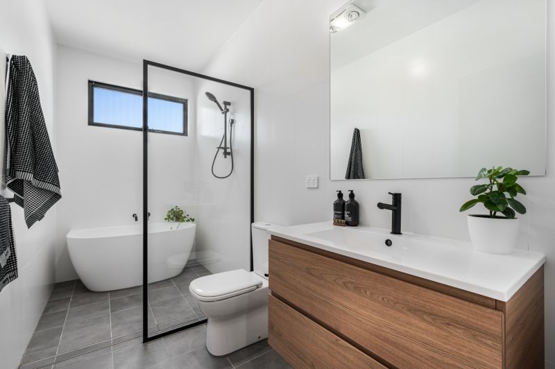 • Reece tapware in bathrooms and powder rooms, paired with stylish full-height tiling