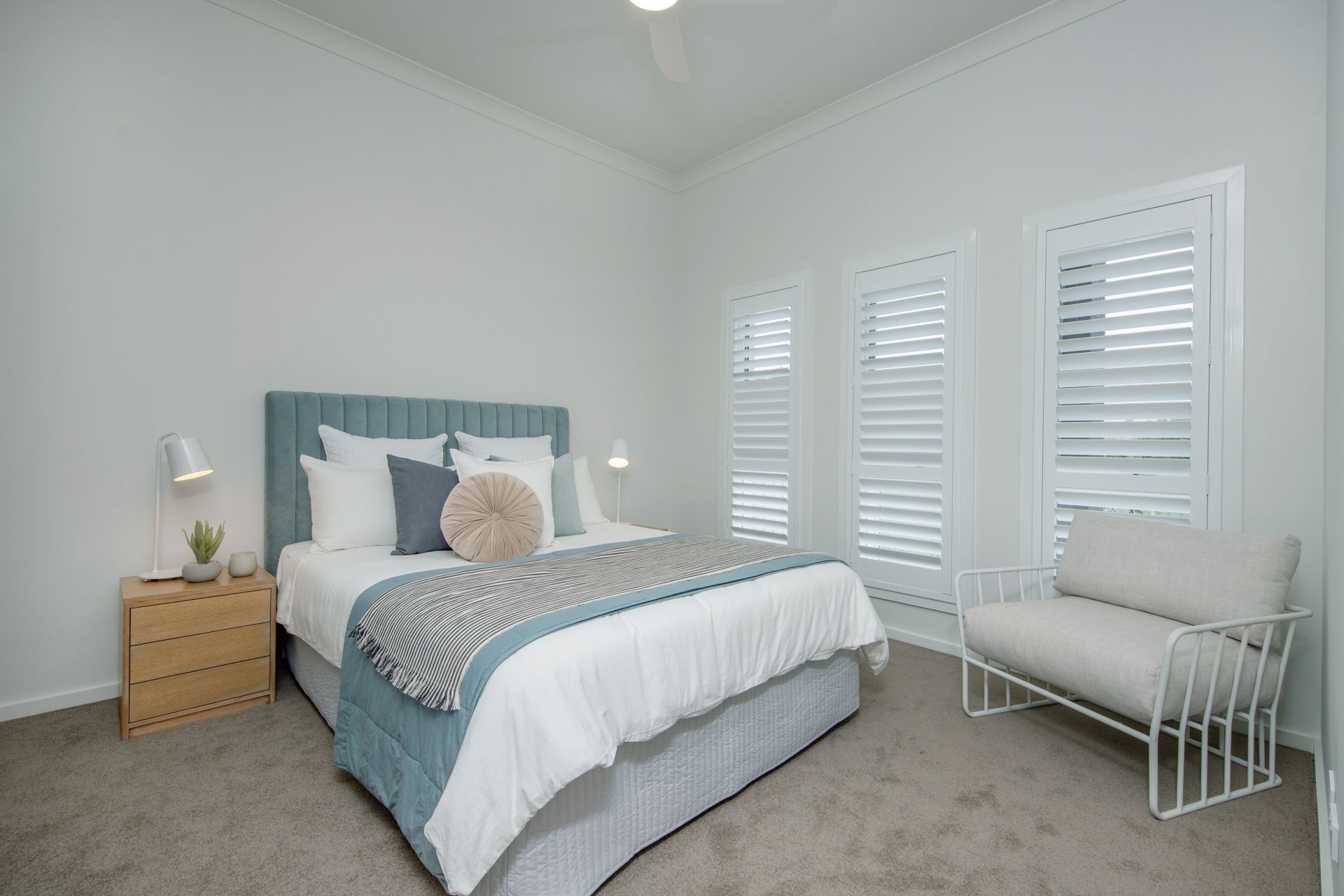Master bedroom with walk-in robe, ceiling fan, plantation shutters and ensuite