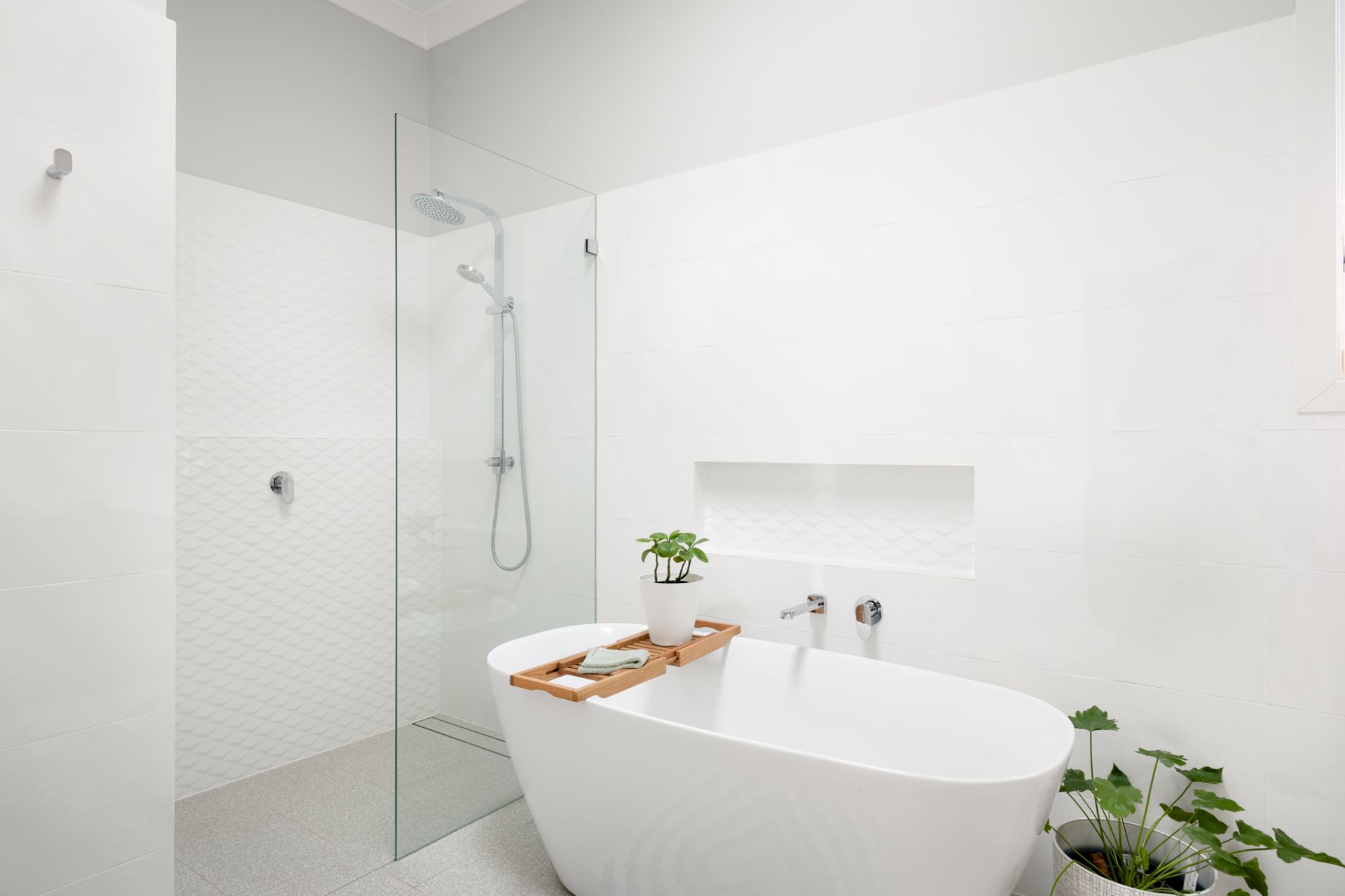 - Sky-lit main bathroom with freestanding bath and frameless glass shower