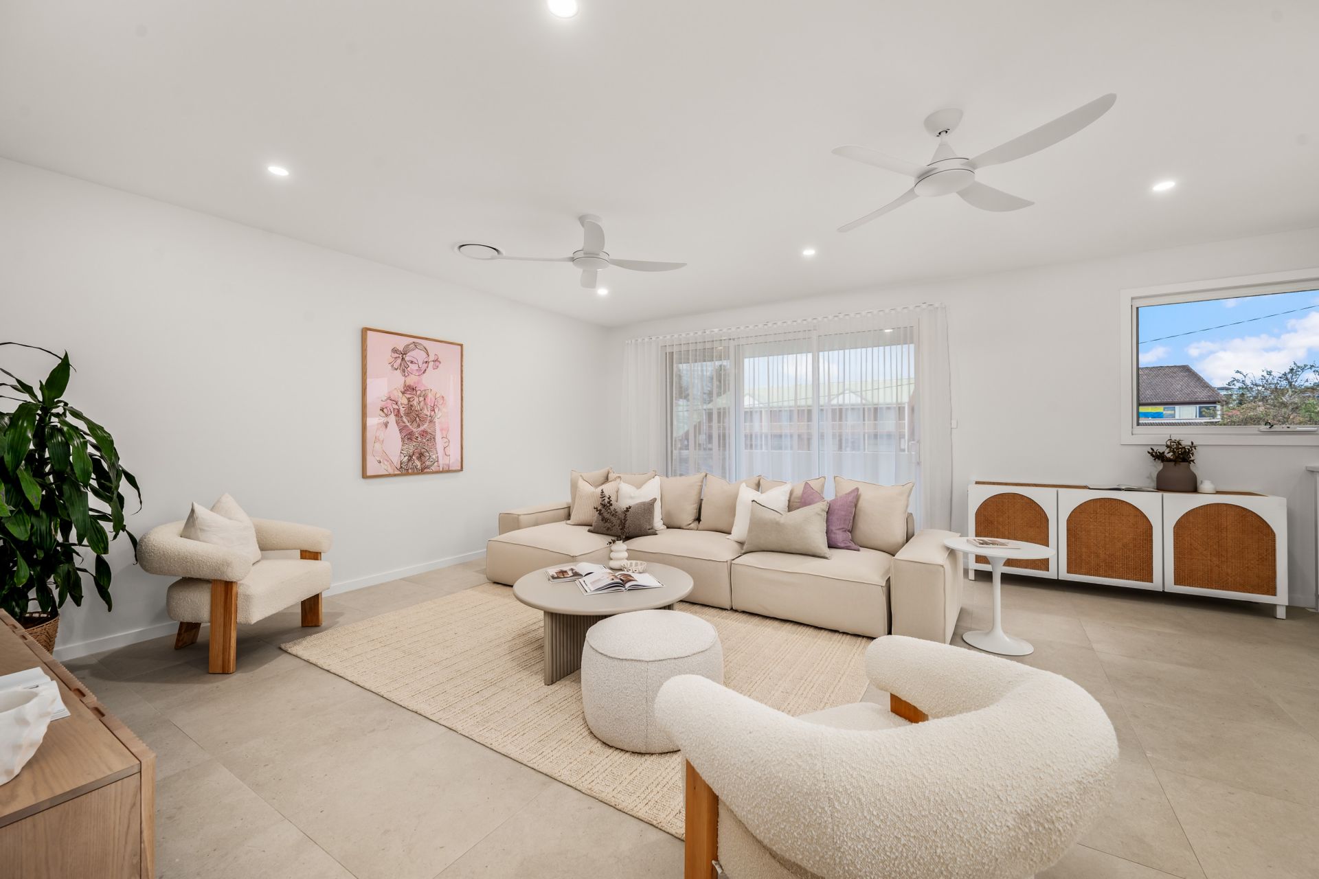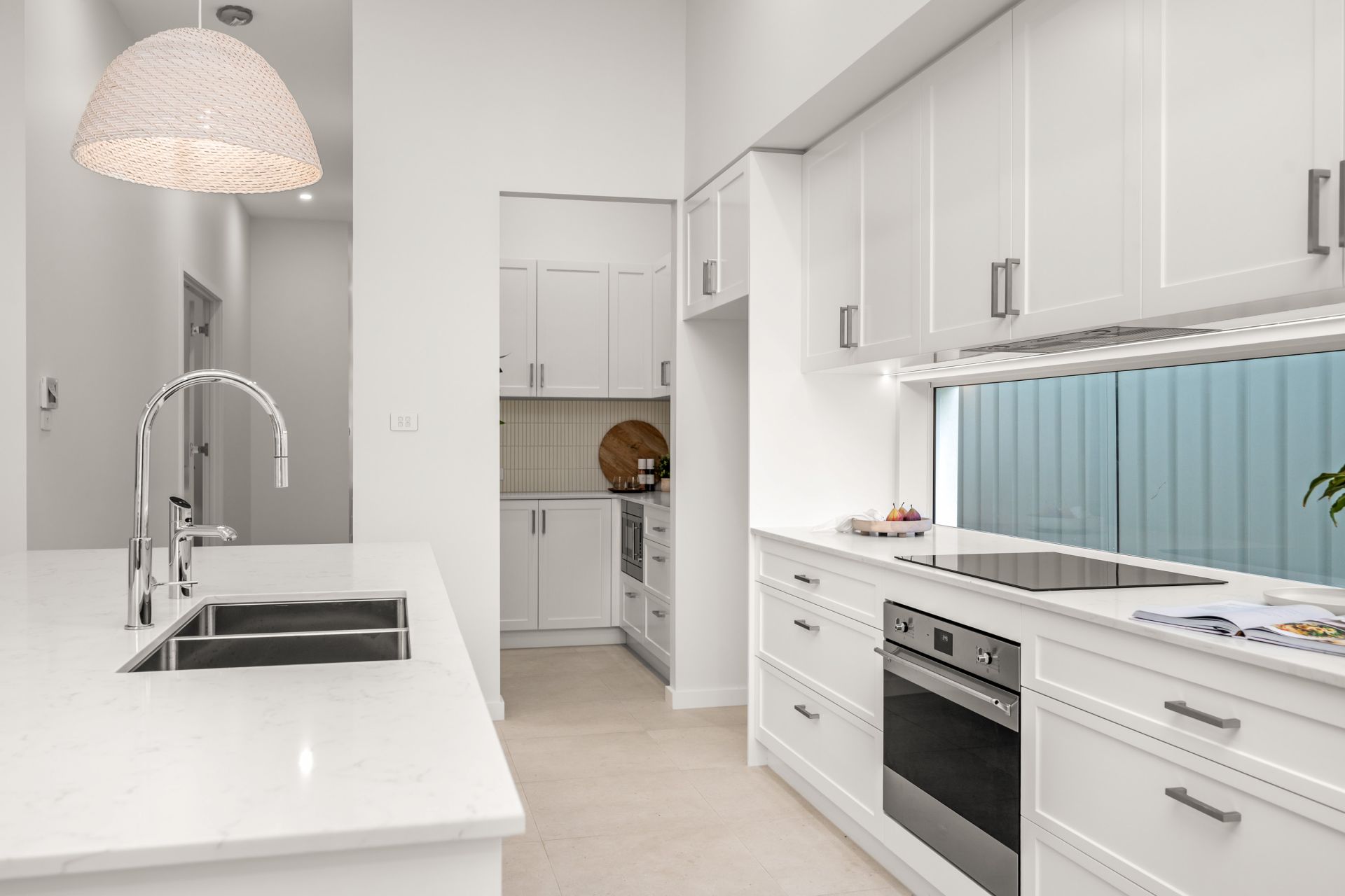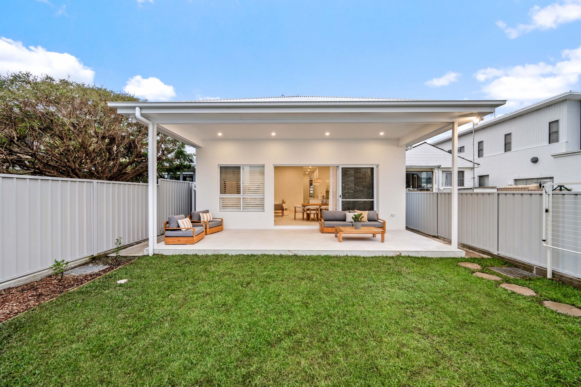 Soaring 3.4m (11ft) ceilings and twin skylights elevate the main living space, anchored by a designer kitchen from Kitchens for Living, complete with 2.7m stone island, Smeg appliances, Zip tap, shaker cabinetry, and a butler's pantry. Glass sliders open to a tiled alfresco and freshly laid lawn, connecting effortlessly to the rear studio.