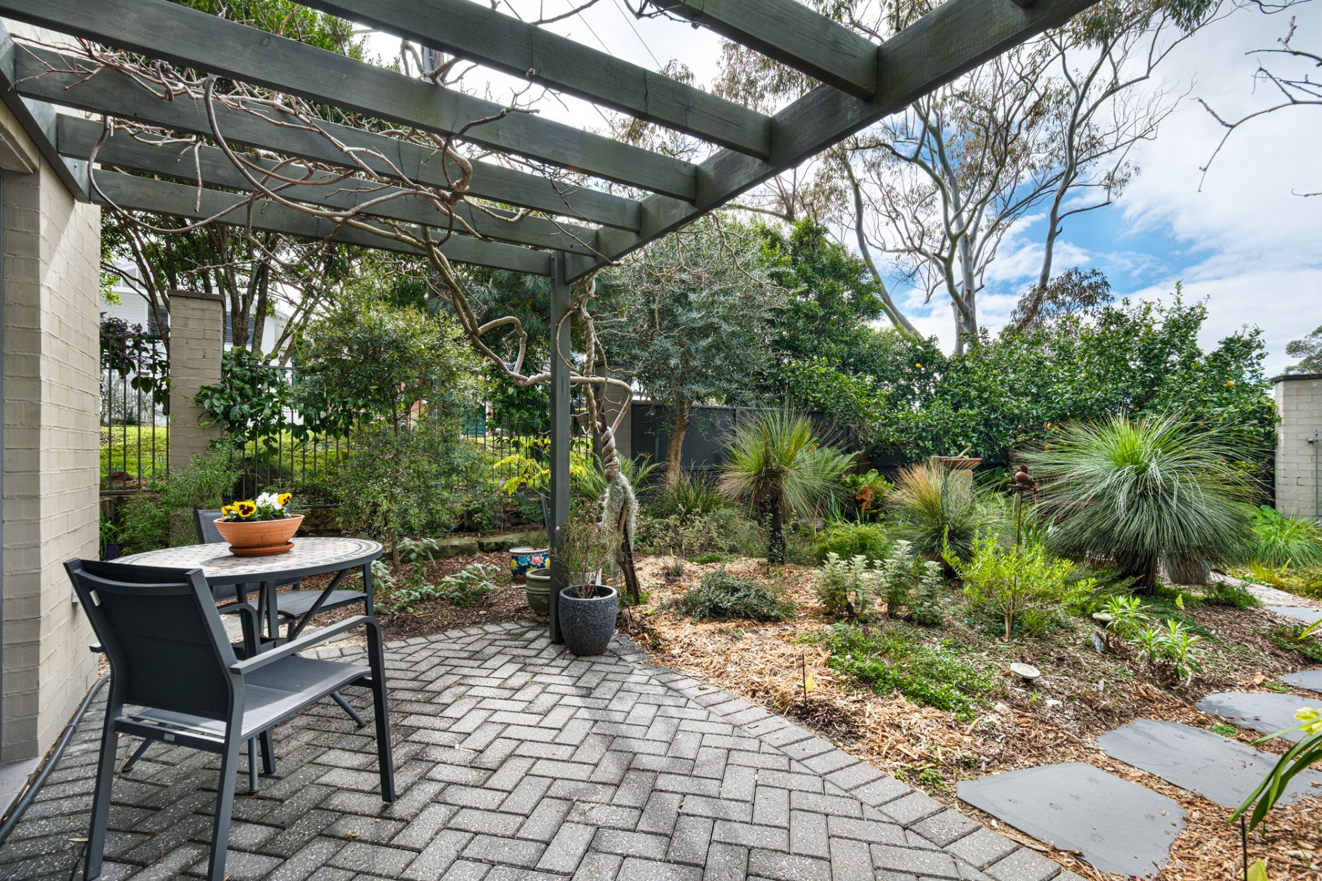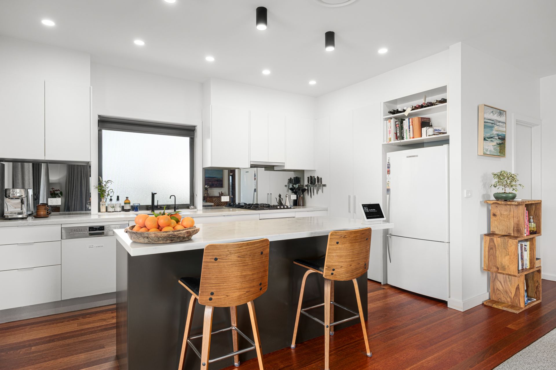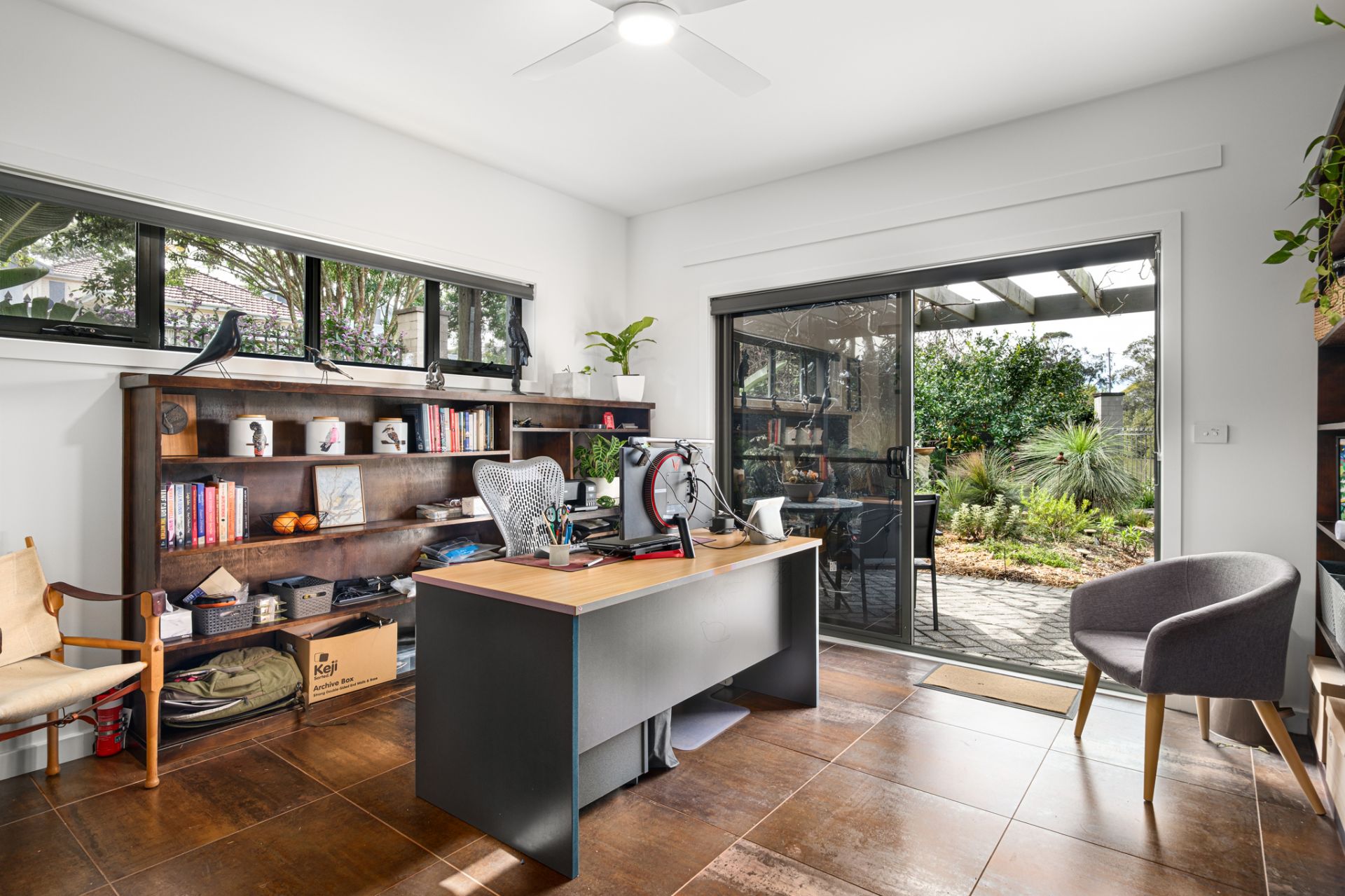 Downstairs, three more bedrooms and a main bathroom with separate toilet are complemented by a generous office with kitchenette and garden access offering a private, distraction-free zone for working from home. The native landscaping draws in birdlife, with citrus trees promising a good yield. Behind an electric gate, the 8.3m-wide garage takes care of parking and storage.