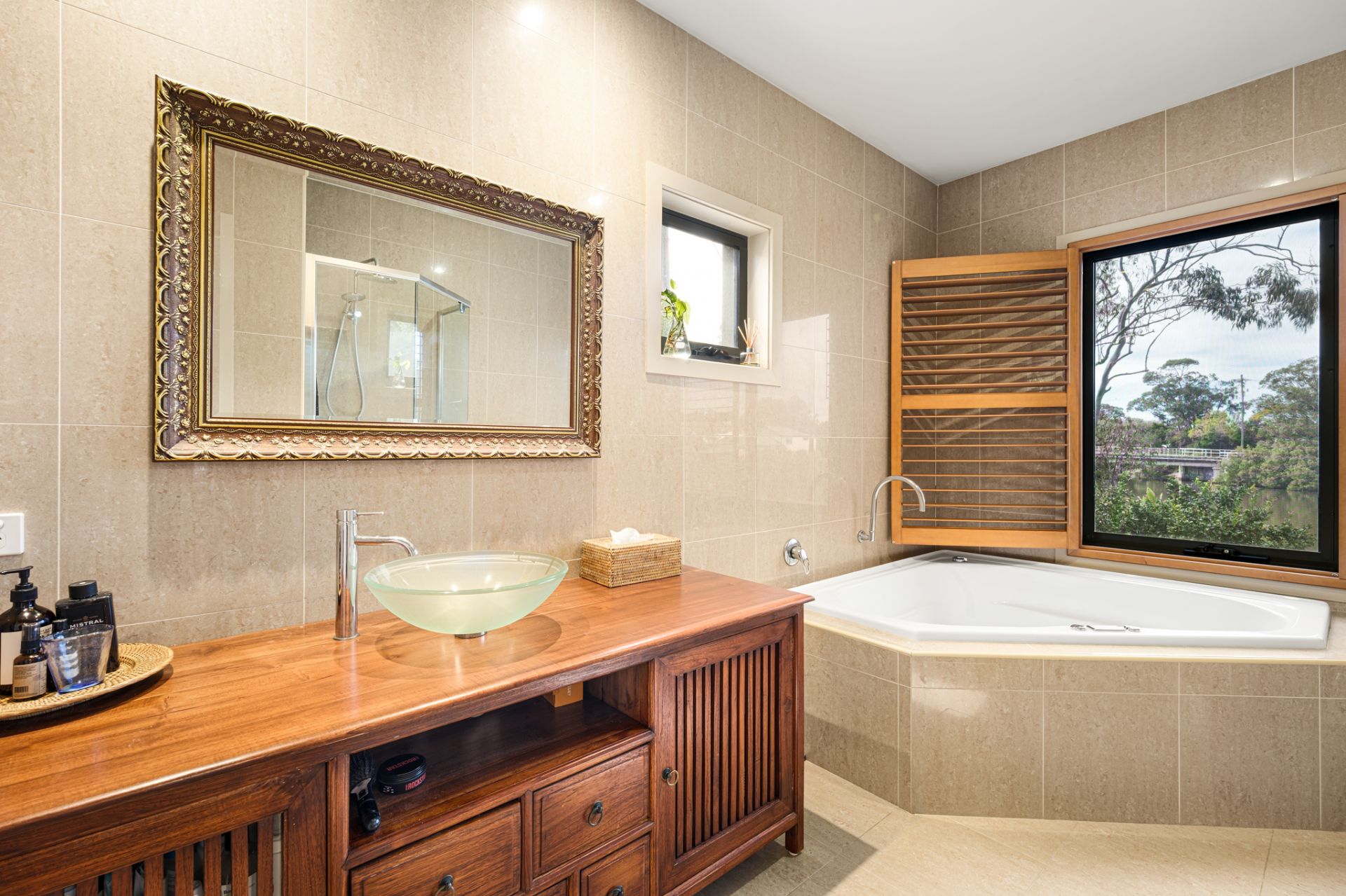 Two separate decks give you front row seats to dragon boats, kayaks, and a family of pelicans. Or take the stairs a few steps away, straight to the water and launch your own kayak for a morning paddle. Inside, the main open plan living/dining area with powder room is anchored by an island kitchen flowing to two separate decks where the creek is your backdrop. The main bedroom features a walk-in robe and spa ensuite where you can literally bathe while watching the water. A spacious TV room behind carved Indonesian doors provides an additional living area.